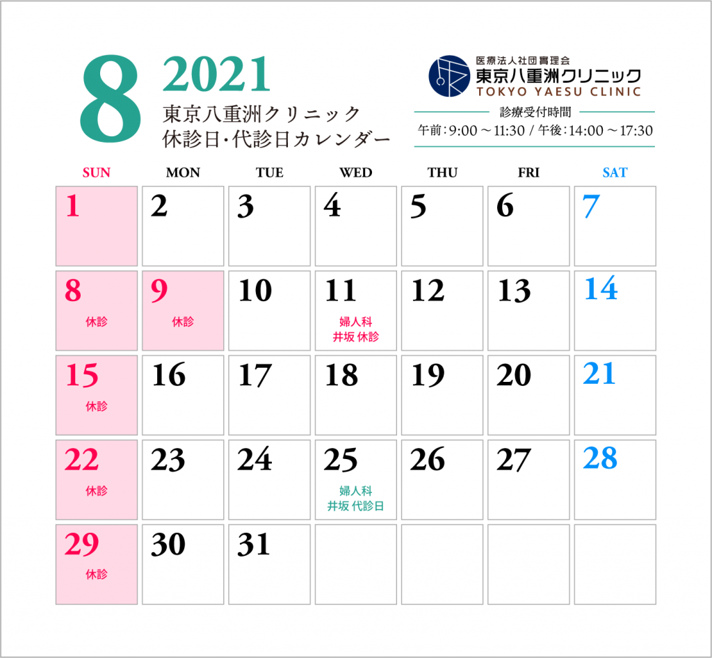 7月・8月の休診日、代診日をお知らせいたします。 《7月14日(水):休診日》婦人科 井坂惠一医師の外来は休診となり、《7月28日(水)代診日》となります。《8月11日(水):休診日》婦人科 井坂惠一医師の外来は休診となり、《8月25日(水)代診日》となります。 calendar 2021.06.28 Mon Share 前へ6月休診日・代診日のお知らせ 次へ【更新】8月・9月休診日・代診日のお知らせ