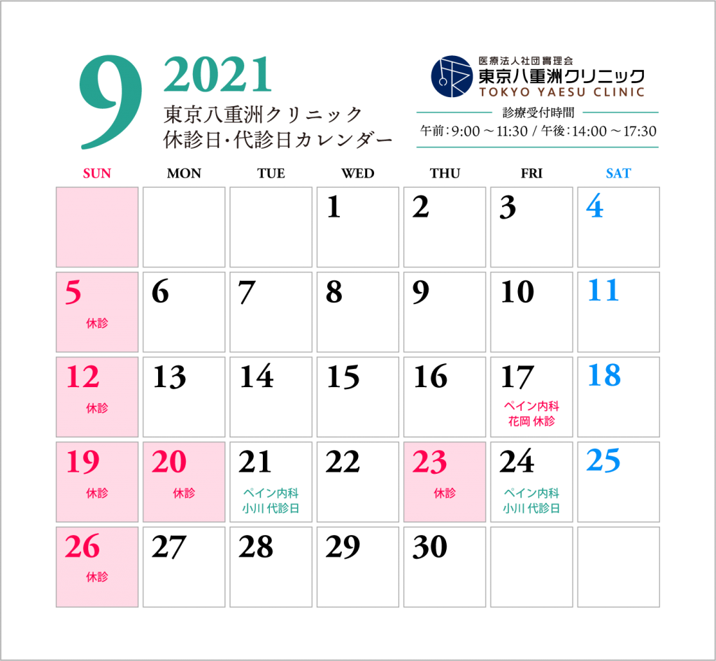 - 《9月21日(火)午前:代診日》はペインクリニック内科 小川 節郎医師の代診診療を行います。 ※4番診察室にて診察
