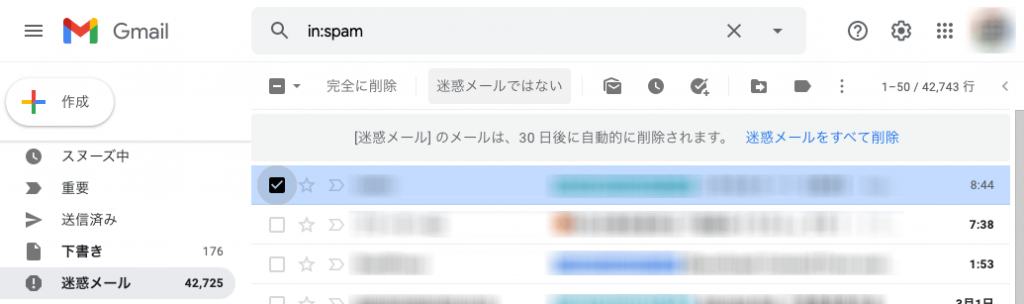 迷惑メールに分類されたメールにチェックを入れると、画面上部に「迷惑メールではない」の文字がグレーバック表示されますので、クリックすると迷惑メールが解除されます。