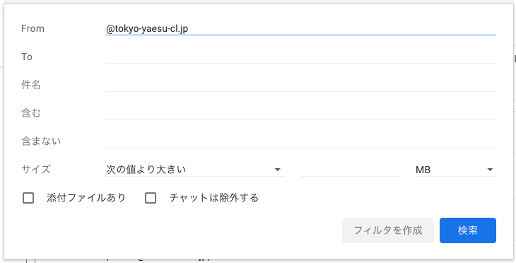 上部にウインドウが出現しますので、[From]の入力スペースに当院のメールアドレスの@より後ろの「@customer.ohori-hosp.jp」を入力し、「この検索条件でフィルタを作成」をクリックします。